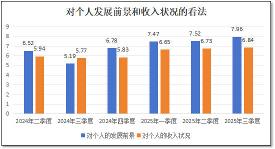 此外,在本次统计调查中,检验检测从业者们对“本人在业内的发展前景信心”这一指标打出的分值为7.96分,同样超越了今年二季度的分值,再创6个季度以来的最高分,但比同期从业者们对检验检测行业整体的发展信心值8.27分要低,这说明从业者们尽管认为行业会向好发展,但对自身在业内的发展前景信心度略低。而对于个人的收入状况满意度的这一指标的看法,2025年3季度末得分为6.84分,也是6个季度以来的最高分,说明随着对行业发展预期的提升,从业者们认为自身的收入状况也会水涨船高。