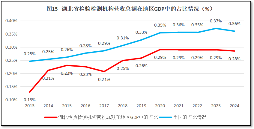 再来看湖北省检验检测机构营收总额在其地区生产总值GDP中的占比情况。2023年度,湖北省检验检测机构营收总额171.03亿元,占当年湖北省GDP值的0.28%,比全国平均值0.36%低了0.08%,排名全国第18(由高到低排序),处于全国中等偏下水平,这也是湖北省多项指标中排名相对靠后的一项。过去12年湖北省检验检测机构营收总额在当地GDP值的比例变化情况,如图15所示。