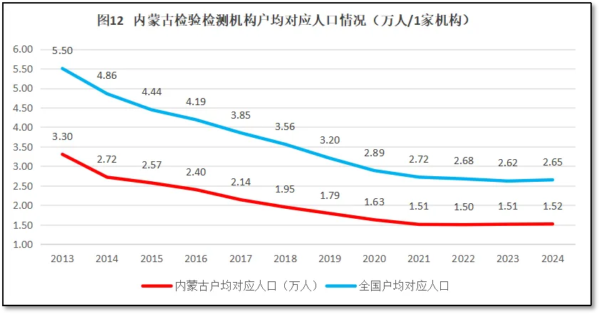 再来看内蒙古自治区地区检验检测机构户均对应服务的人口情况。2024年末,内蒙古自治区常住人口2388万人,检验检测机构户均服务人口1.52万人,比全国平均数2.65万人低了1.13万人,排名继续为全国最末尾。可见,相对于内蒙古自治区较少的人口数量来说,当地的检验检测机构数量显得过多了。过去12年,内蒙古自治区检验检测机构户均对应的人口数量与全国的情况进行比较,如图12所示。