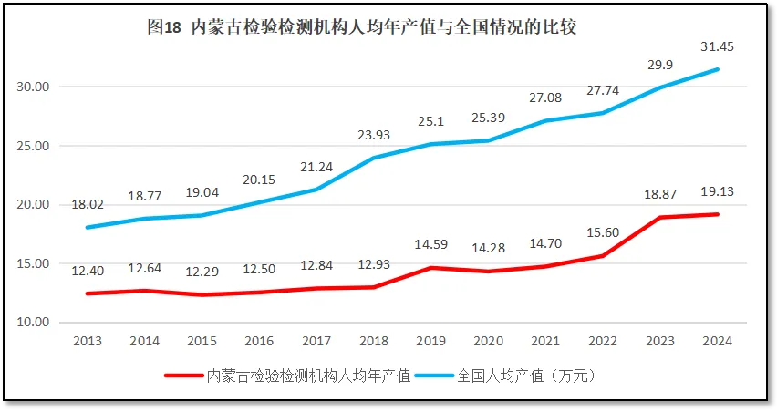 内蒙古自治区检验检测机构人均年产值与全国的情况比较如图18所示。