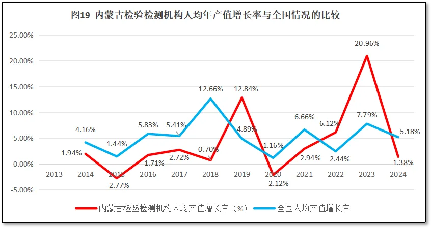 再来看内蒙古自治区检验检测机构人均年产值增长率与全国人均年产值增长率的比较,如图19所示。