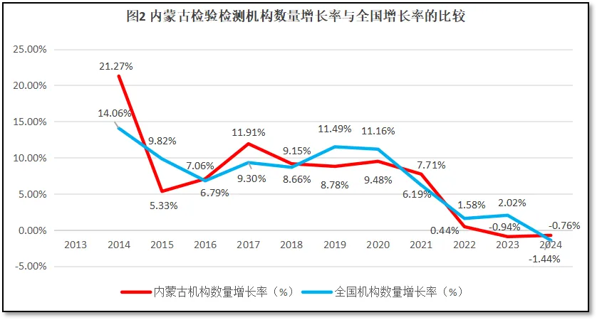 内蒙古自治区检验检测机构数量增长率与全国检验检测机构数量的增长率进行比较,结果如图2所示。