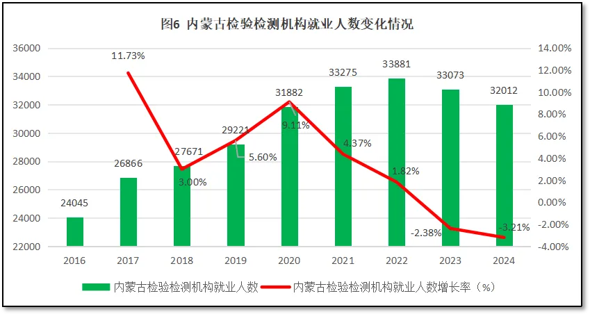由图6可见,最近9年内蒙古自治区检验检测机构从业人员数量从2016年的2.4万人增长到2022年的3.38万人之后开始下降,2024年末仅有3.2万人。从增长率曲线看,除了因为2017年数据偏差导致数据起伏较大之外,2020年内蒙古自治区检验检测机构从业人数有一个9.11%的较高增幅,此后增长率逐年下降,到2024年增长率降到-3.21%,连续两年出现就业人数净减少。