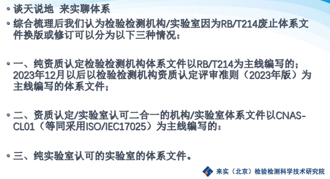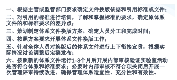 徐老师主要从好的体系是如何炼成的为出发点,并基于当前RB/T214废止的的形式下,实验室管理体系换版或修订的情景分析,主要从三个方面进行了阐述。