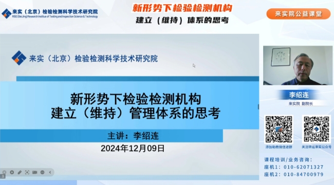 “新形势下检验检测机构建立(维持)体系的思考”落下帷幕,本次直播讲座由电竞牛院李绍连老师主讲,整场直播历时近3个小时,观看量达5000多人次,授课内容受到学员的一致好评。